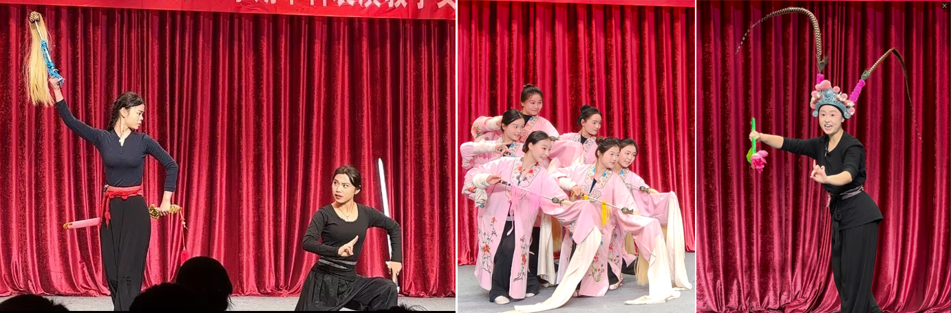 展演现场灯光璀璨,氛围热烈。参演学子身着精致戏服,以饱满情感与精湛技艺演绎经典 ——《天仙配》“夫妻双双把家还”的悠扬唱腔、《女驸马》“为救李郎离家园”的果敢演绎,以及《打猪草》中充满生活气息的诙谐桥段,轮番呈现。生旦净丑各行当齐全,抒情、叙事等多种艺术风格交融,学子们唱念做打韵味悠长,手眼身法步灵动传神,将七仙女的纯真、冯素珍的坚韧等人物形象刻画得入木三分,原汁原味的黄梅戏韵味赢得台下师生阵阵掌声。
