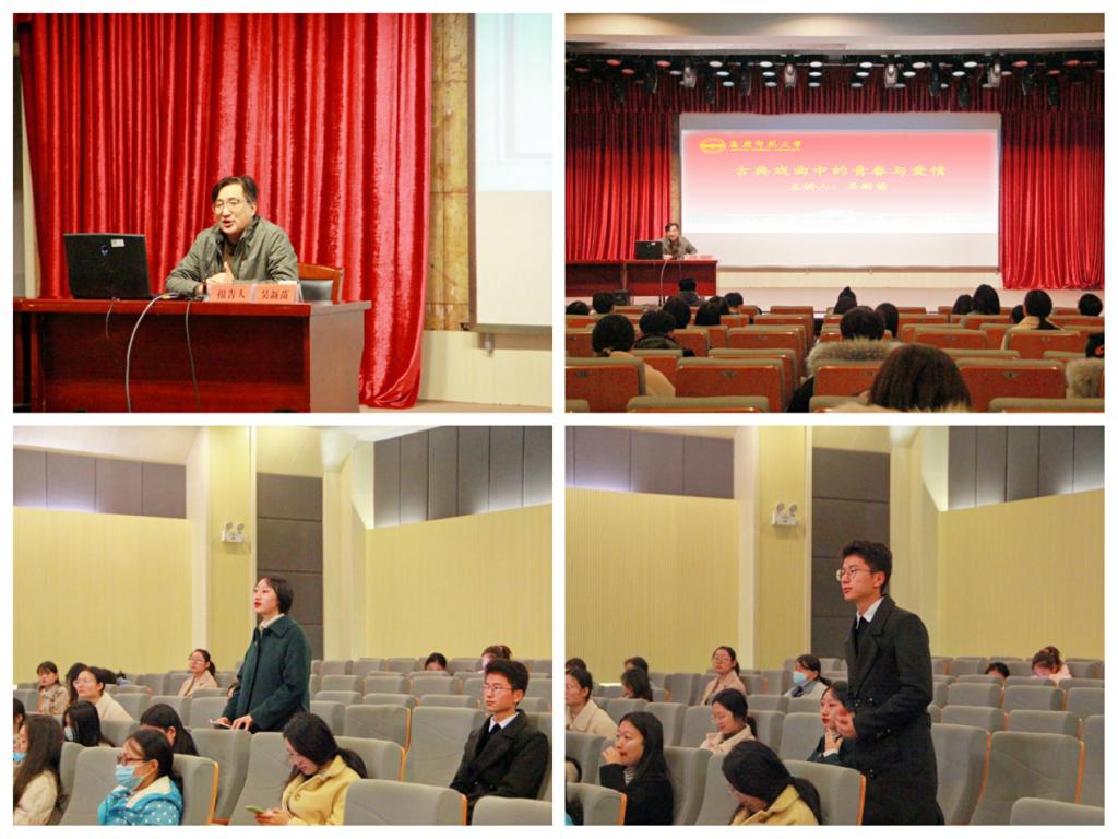 在互动环节,吴教授与在座师生围绕传统戏曲的当下传承与发展等问题进行了深入交流。讲座最后,主持人储著炎老师作总结发言,认为这次专题讲座很有意义,要求同学们一定要珍惜青春,树立正确的爱情观和婚姻观,要学会学习、学会生活、学会思考,在今后的艺术实践中创作出更多富于青春气息、符合时代审美与价值取向的好作品。(撰稿:许慧娟 摄影:徐越 审核:储著炎)