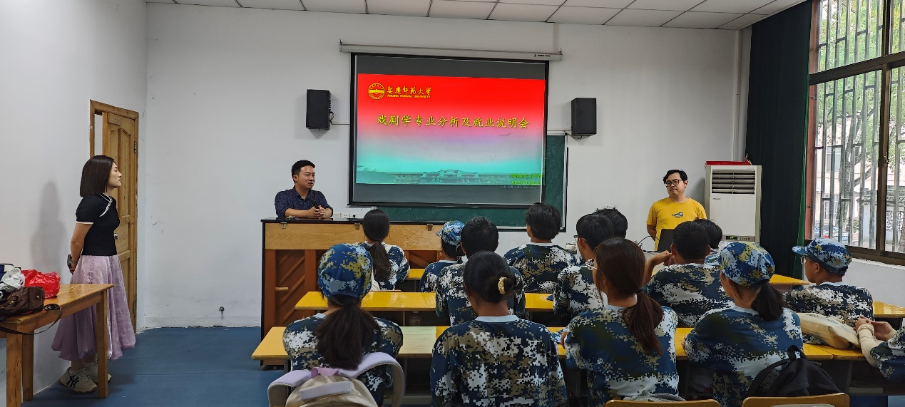 在黄梅剧艺术楼一楼排练厅召开戏剧学专业新生见面会。学院党总支书记汪超、专业硕士生导师宋璨璨、班级辅导员和戏剧学专业全体新生参加见面会。