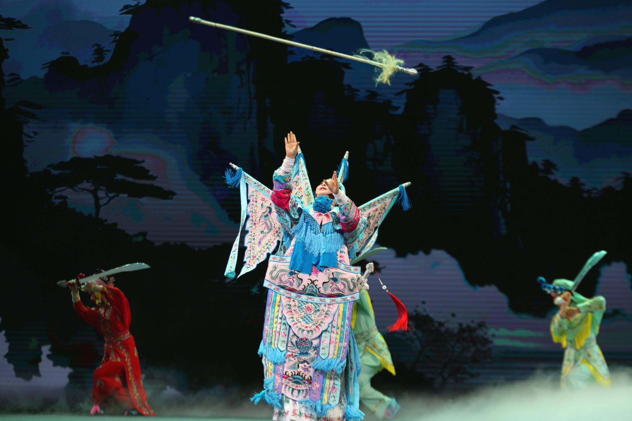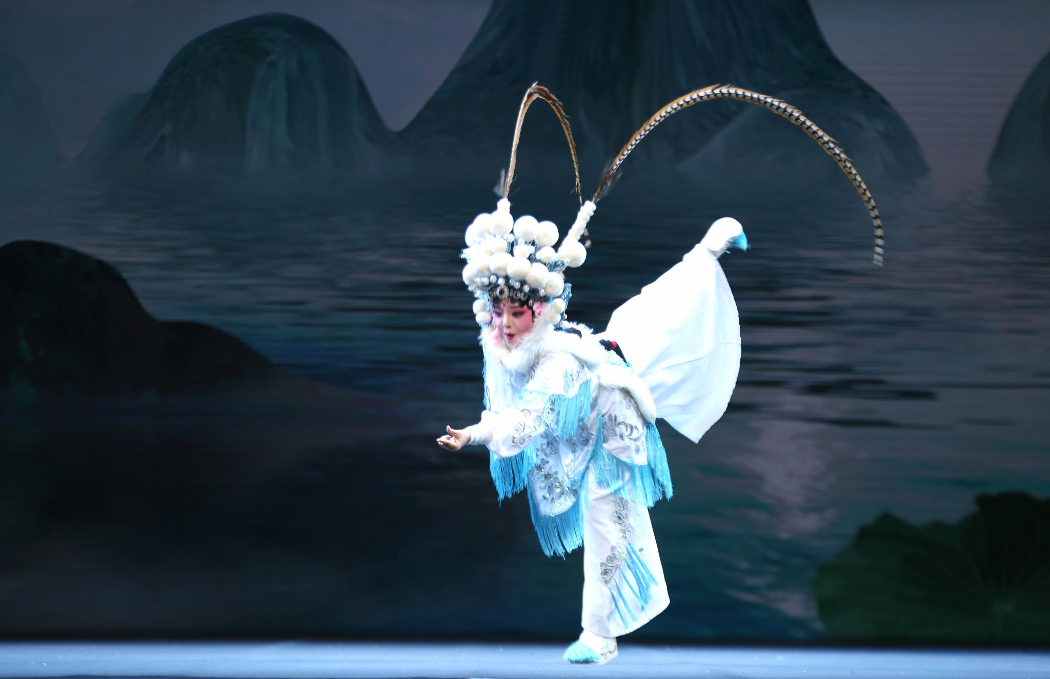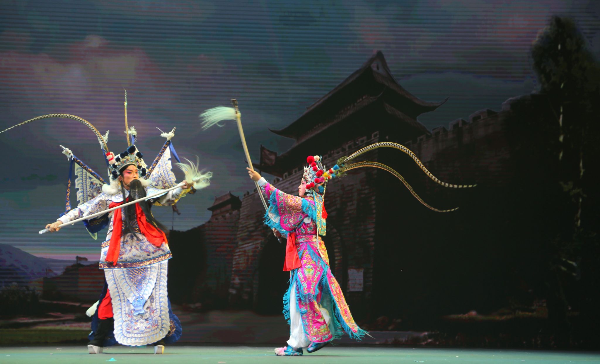 戏曲传承,无技不成艺,不技不惊人。整场演出精彩纷呈,文戏与武戏轮番上演,且以武戏居多,尽显戏曲传承的绝技与绝活。《打金砖》中陈郝同学繁复的“甩发”动作,吊毛、抢背、倒扑虎、倒僵尸,动作流畅,一气呵成,赢得现场观众掌声雷动。吴银梅和金文亮同学在《活捉》中你来我往的对手戏表演,逗得观众哈哈大笑,惊叹不已。周地同学在《投江》中的加长水袖与唱念做打, 汪金娟等同学在《扈家庄》中的大段做功与手眼身法步……,舞台上唱念做打,挥洒传统戏曲的时代风流,学生的精彩表演,尽显青春黄梅的时尚魅力。